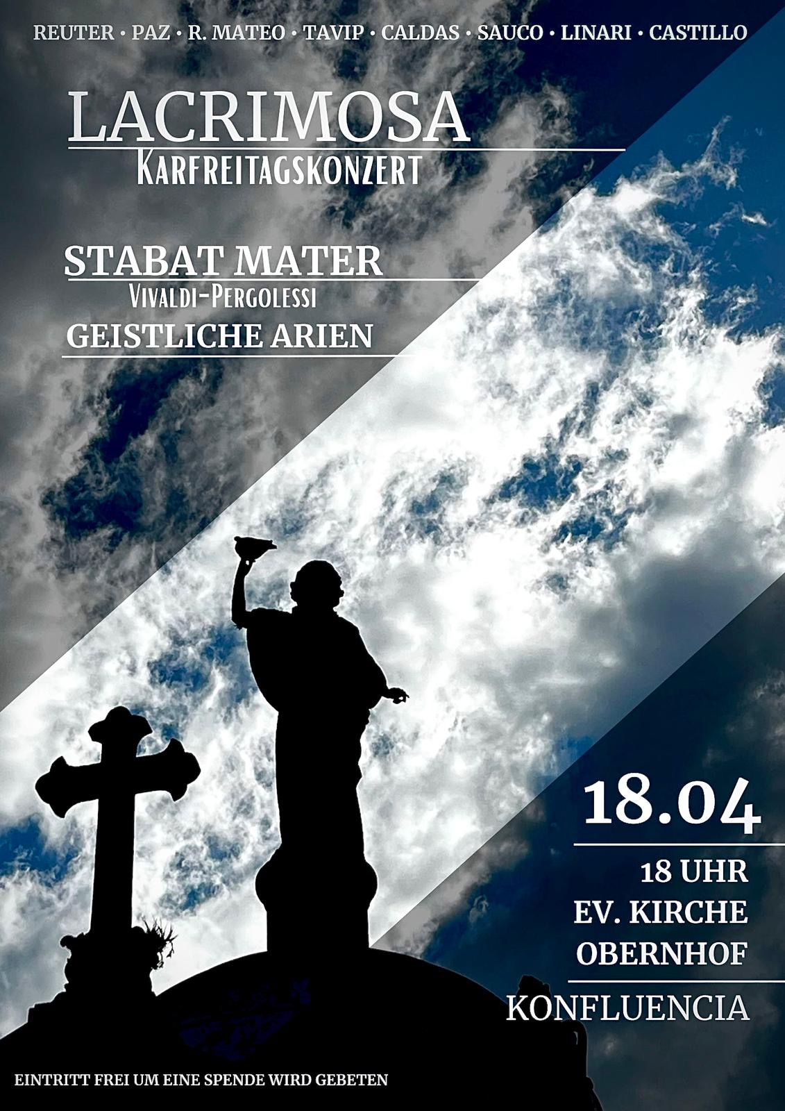 Es ist schon eine liebgewonnene Tradition: Am Karfreitag, dem 18. April, um 18.00 Uhr bietet der argentinische Tenor Walter Castillo mit seinen Freunden, dem Ensemble Konfluencia (s. Anhang), eine Passionsmusik in der ev. Barockkirche Obernhof. Arien von Bach, Mozart, Verdi, Vivaldi und vor allem aus dem „Stabat Mater“ von Pergolesi, vorgetragen von wunderbaren Stimmen, begleitet von Michael Reuter am Klavier, versetzen die Besucher in eine sowohl expressive wie intime Stimmung. Die Künstler laden herzlich ein - gerade in diesen aufwühlenden Zeiten - zu einer besinnlichen und zur inneren Ruhe zurückführenden Stunde.