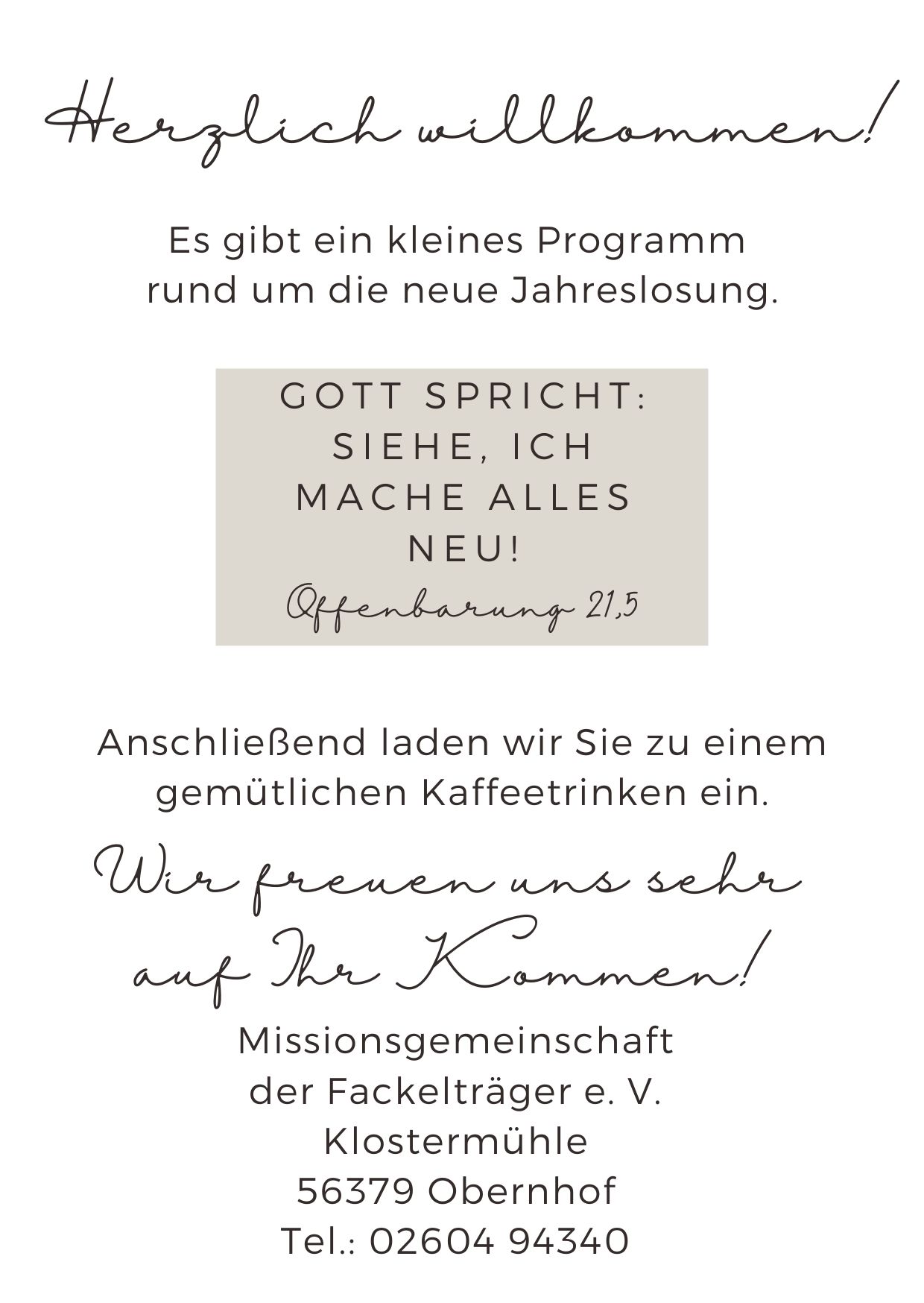 Es gibt ein kleines Programm rund um die neue Jahreslosung. Gott spricht: Siehe, ich mache Alles neu! (Offenbarung 21,5)